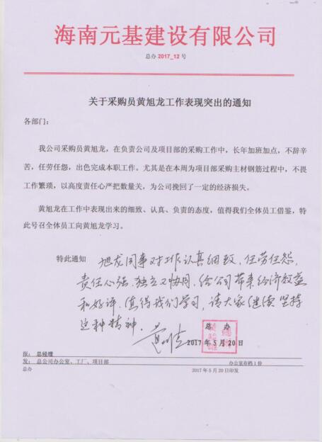 對公司采購員黃旭龍工作表現(xiàn)突出的通知