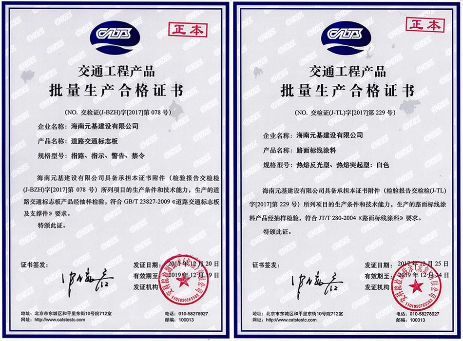 產(chǎn)合格證書(shū)”、“路面標(biāo)線涂料批量生產(chǎn)合格證書(shū)”